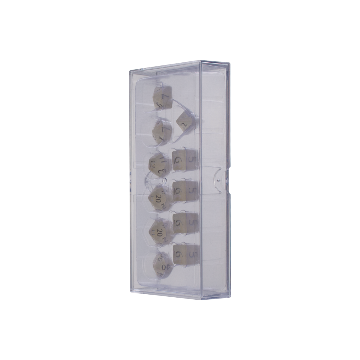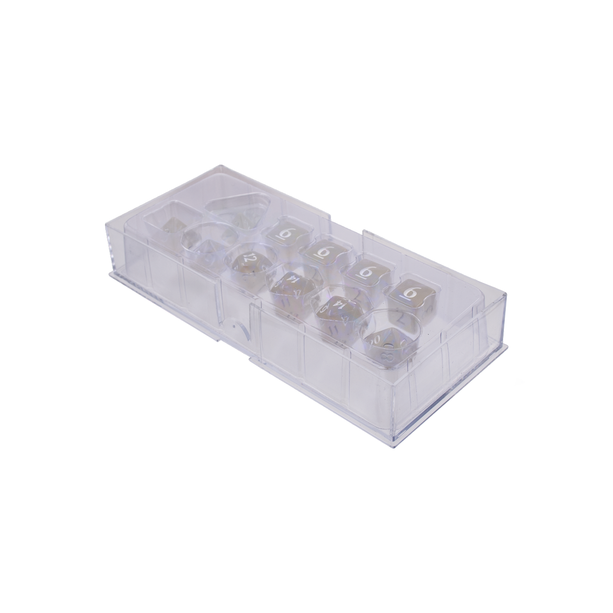 • 11 shimmering acrylic dice in a 2-piece storage box