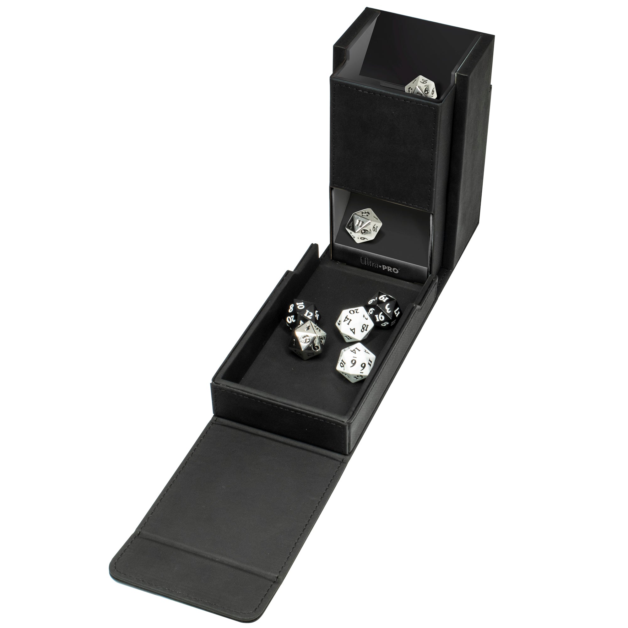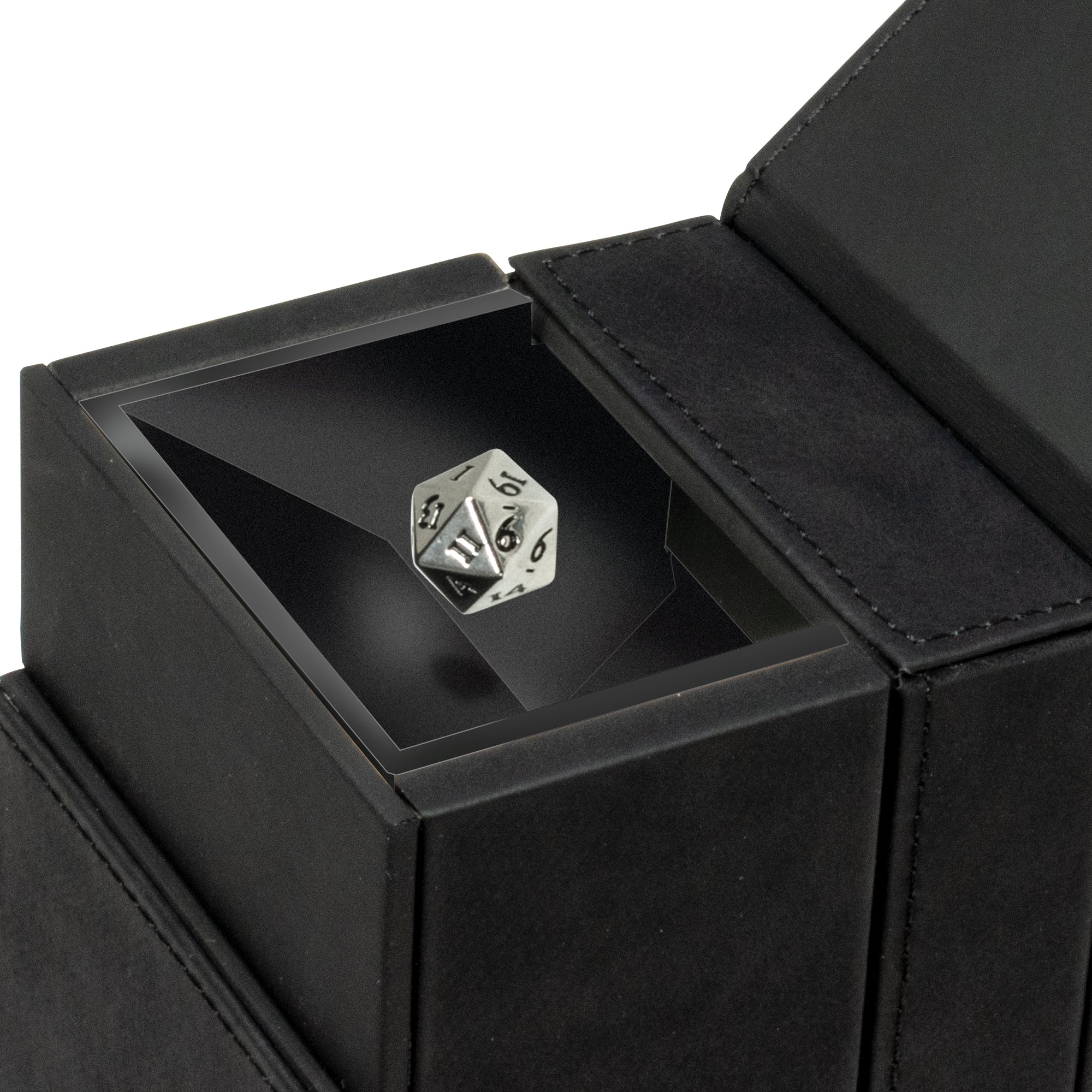 The Alcove Dice Tower is the ultimate tabletop gamer's companion. Equipped with a soft suede leatherette exterior and durable core, you can store and roll dice all in a single 3.75 in. x 3.35 in. x 5.90 in. space. The lid flips down to release dice into a walled dice catching tray. Drop dice through 3 injection molded ramps to ensure durability and randomized rolls. When you are done playing, you can flip up the attached tray to store 40+ standard sized RPG dice and secure the dice tower shut with the strong magnetic closure that Ultra PRO's Alcove accessories are famous for. (Dice not included)