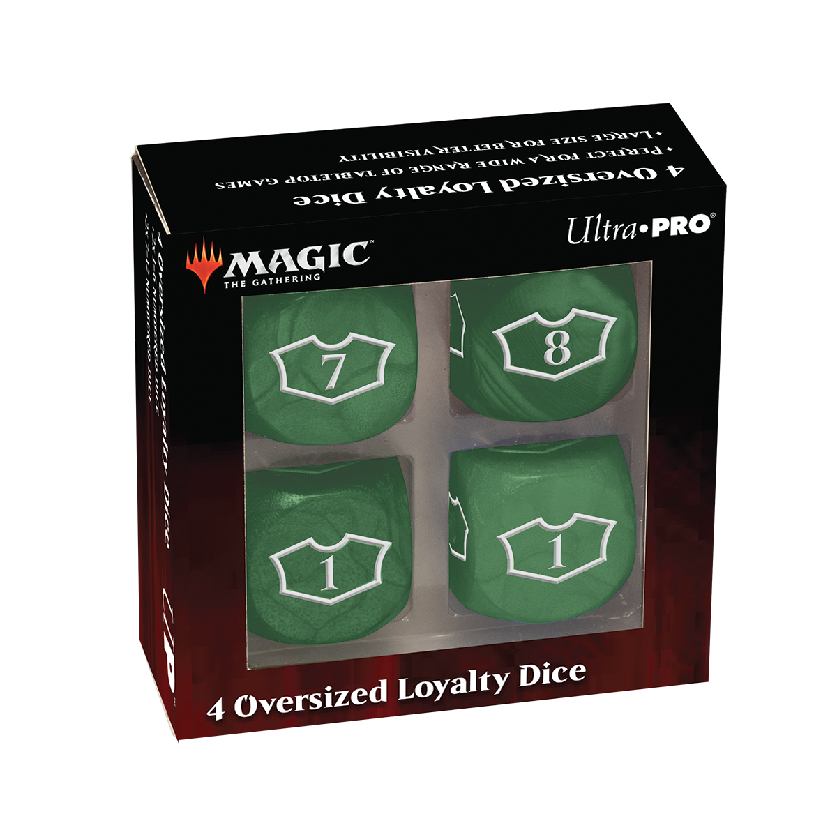 Show your Loyalty with the updated Deluxe Loyalty Dice for Magic: the Gathering! Each face features the iconic "loyalty" outline with numbers 1-6 on two dice and 7-12 on the other two dice, allowing you to save up for that ult with a single die face representing your progress clearly. Each set includes four (4) six-sided dice, measuring 22mm, packaged in a reusable storage box. Rounded corners allow dice to roll further for better randomization and protects gaming table surfaces from dents or marks.