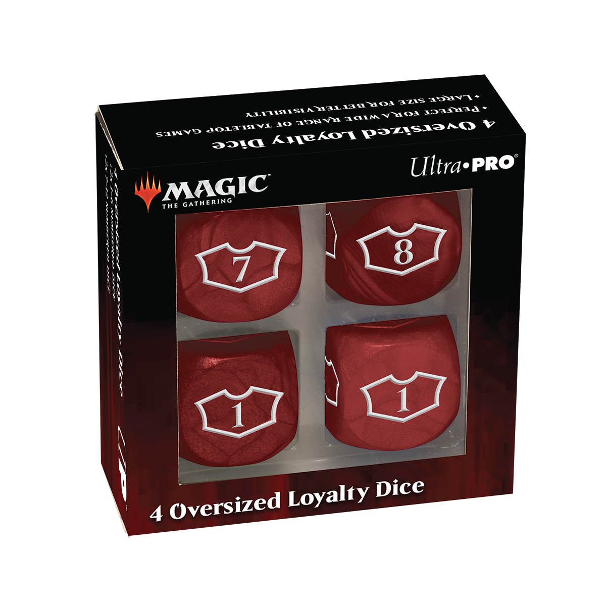 Show your Loyalty with the updated Deluxe Loyalty Dice for Magic: the Gathering! Each face features the iconic "loyalty" outline with numbers 1-6 on two dice and 7-12 on the other two dice, allowing you to save up for that ult with a single die face representing your progress clearly. Each set includes four (4) six-sided dice, measuring 22mm, packaged in a reusable storage box. Rounded corners allow dice to roll further for better randomization and protects gaming table surfaces from dents or marks.