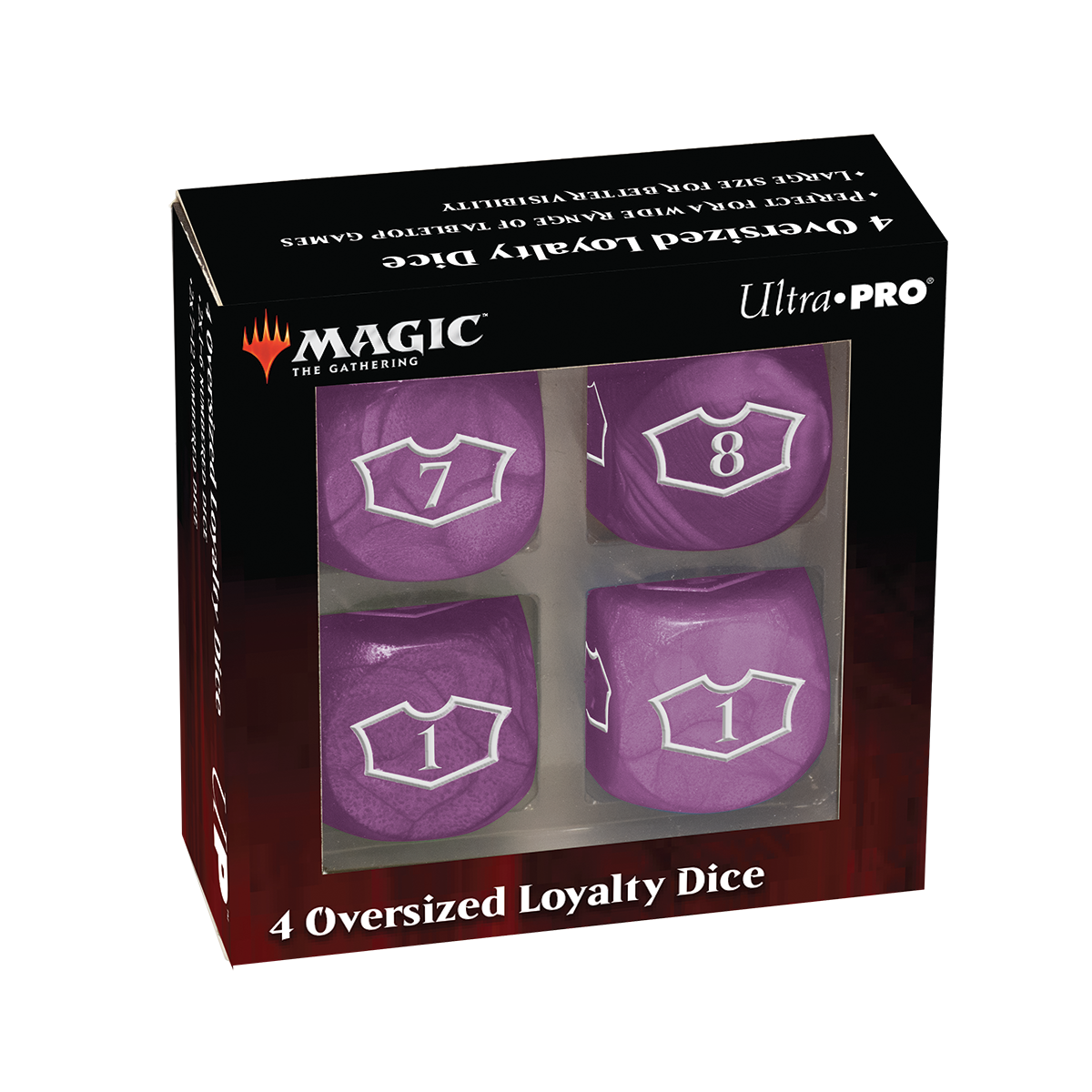 Show your Loyalty with the updated Deluxe Loyalty Dice for Magic: the Gathering! Each face features the iconic "loyalty" outline with numbers 1-6 on two dice and 7-12 on the other two dice, allowing you to save up for that ult with a single die face representing your progress clearly. Each set includes four (4) six-sided dice, measuring 22mm, packaged in a reusable storage box. Rounded corners allow dice to roll further for better randomization and protects gaming table surfaces from dents or marks.