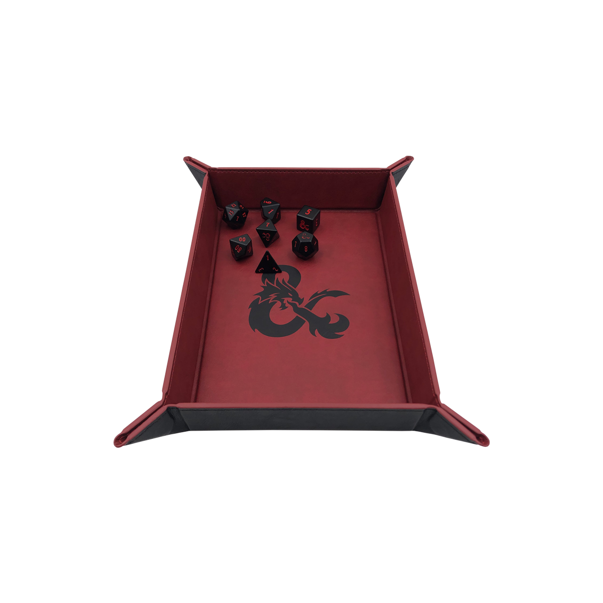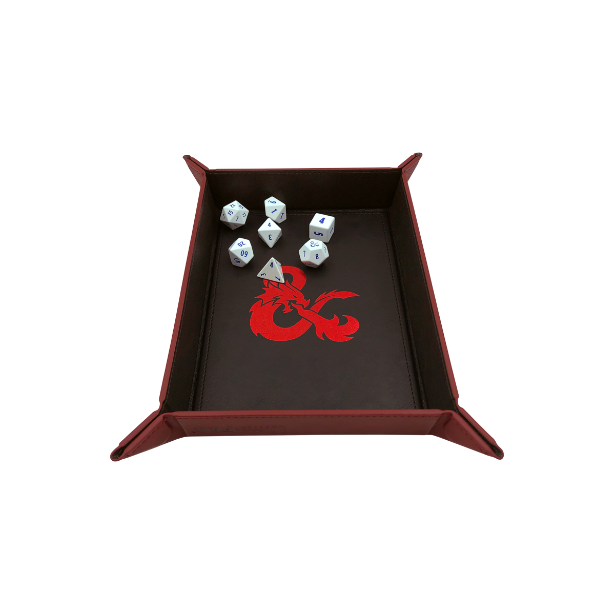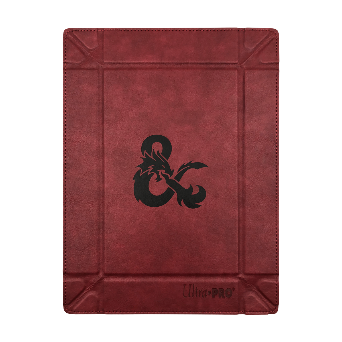 Ultra PRO's Foldable Tray of Rolling for Dungeons & Dragons offers a safe and aesthetic space for rolling dice. These trays are no bigger than a sheet of paper (8.5 in. x 11 in.) when flat, and utilize small magnets in each corner to easily pop up walls to keep dice under control when rolling - no bulky clasps or snaps needed! Store your dice rolling tray easily in your backpack or character folio. The Foldable Tray of Rolling is reversible! With one side a black leatherette material with a red foil Dungeons & Dragons logo, and the other featuring an inverted red leatherette with a high gloss black logo, the Foldable Tray of Rolling is the perfect addition to any gaming dungeon.