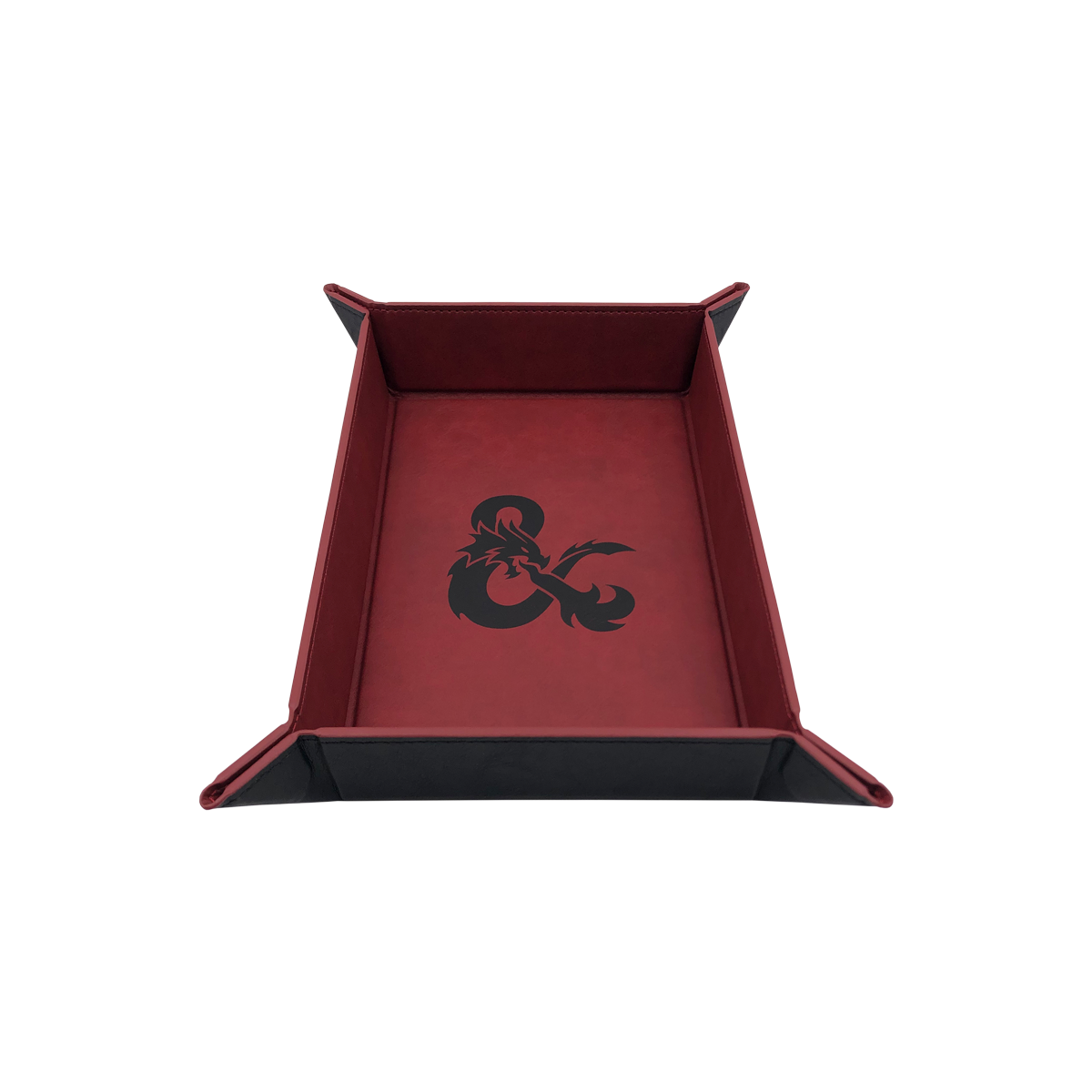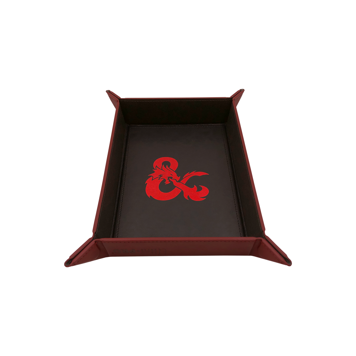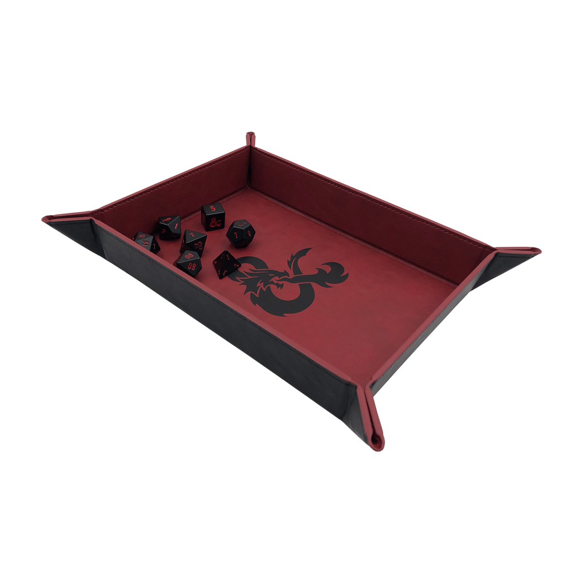 Ultra PRO's Foldable Tray of Rolling for Dungeons & Dragons offers a safe and aesthetic space for rolling dice. These trays are no bigger than a sheet of paper (8.5 in. x 11 in.) when flat, and utilize small magnets in each corner to easily pop up walls to keep dice under control when rolling - no bulky clasps or snaps needed! Store your dice rolling tray easily in your backpack or character folio. The Foldable Tray of Rolling is reversible! With one side a black leatherette material with a red foil Dungeons & Dragons logo, and the other featuring an inverted red leatherette with a high gloss black logo, the Foldable Tray of Rolling is the perfect addition to any gaming dungeon.